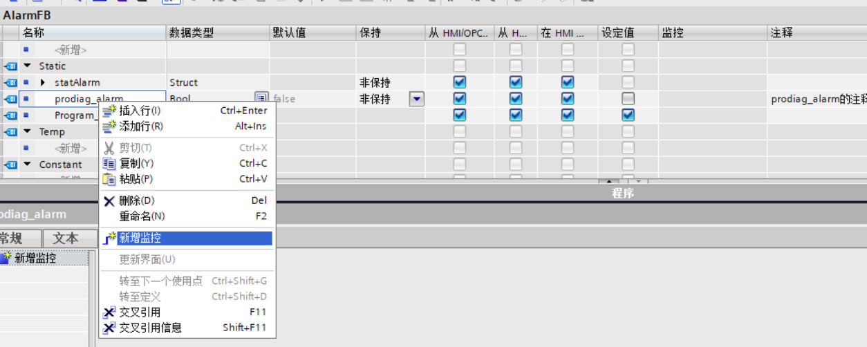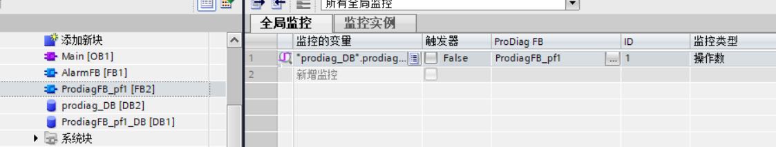添加新块,语言选择PRODIAG(含IDB),就可以建立一个ProdiagFB,图是建立完成并监控了一个数据后的样子。