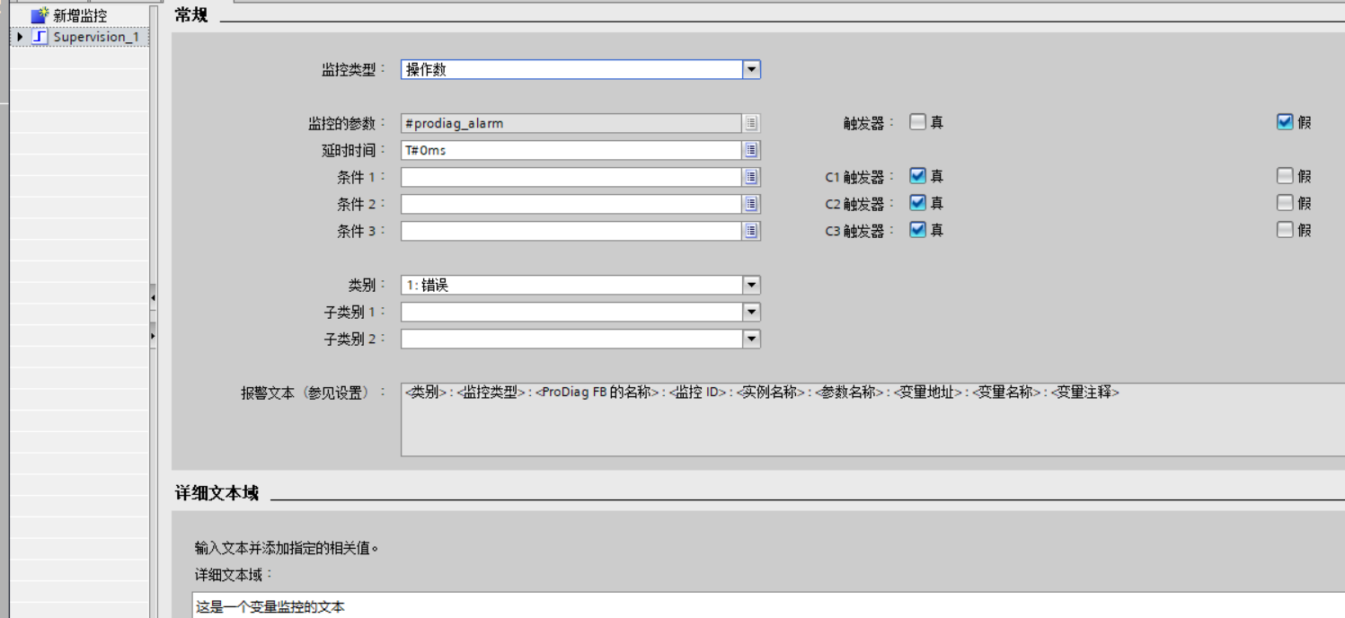 <类别> : <监控类型> : <ProDiag FB 的名称> : <监控 ID> : <实例名称> : <参数名称> : <变量地址> : <变量名称> : <变量注释>,注意,这意味着它甚至可以把你的变量符号,变量地址,变量注释当作报警文本的一部分输出出来。