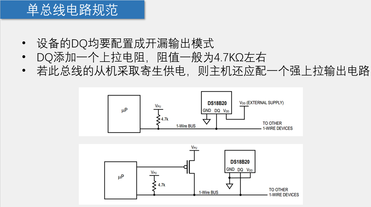 - 寄生供电,相当于从机在主机侧取电;强上拉:直接把VCC接到DQ上。