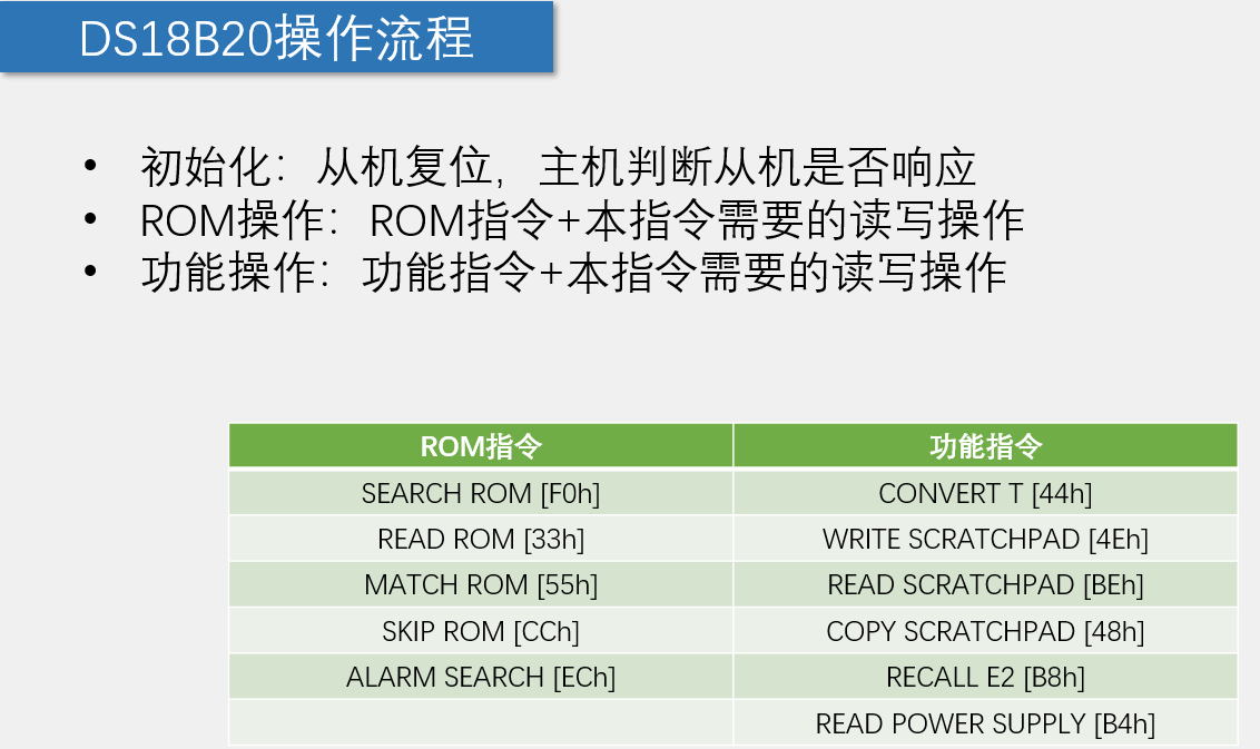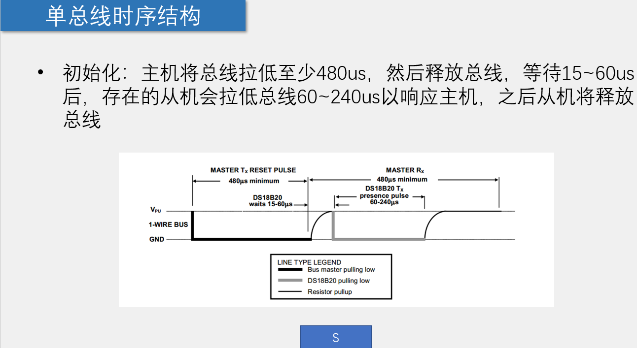 - 初始化相当于I2C中的Start;注意此处使用的绝对时间(一线制没办法靠相对时间);主机先拉低BUS(写IO),释放后BUS会被电阻弱上拉高,等到一段时间后,检查该信号是否被从机拉低(读IO),拉低则从机有响应。