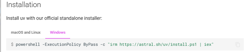 powershell -ExecutionPolicy ByPass -c "irm https://astral.sh/uv/install.ps1 | iex"安装: