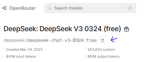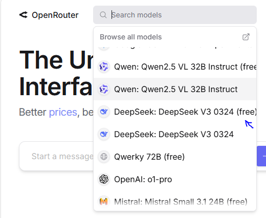 - 这里选OpenRouter,在左上角模型搜索框中搜索 DeepSeek,选择 DeepSeek V3 0324(free)版本: