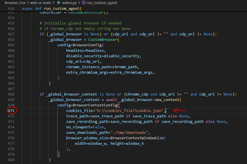 - 可以通过把本地的浏览器cookie导出为json文件,再通过修改webui.py文件,使其读出默认cookie信息,对于一些需要登陆的网站,可以做到免登录,如下: