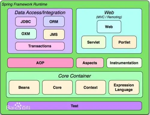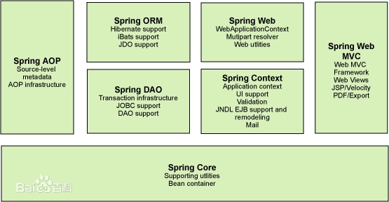1、核心容器:核心容器提供 Spring 框架的基本功能(Spring Core)。核心容器的主要组件是 BeanFactory,它是工厂模式的实现。BeanFactory 使用控制反转(IOC) 模式将应用程序的配置和依赖性规范与实际的应用程序代码分开 [3] 。