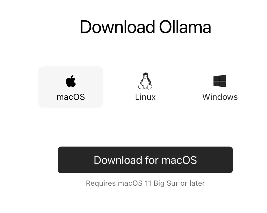 Ollama可以简单理解为客户端,实现和大模型的交互,读者可以前往https://ollama.com/download,根据操作系统类型下载对应的客户端,比如笔者下载的是macOS的。
