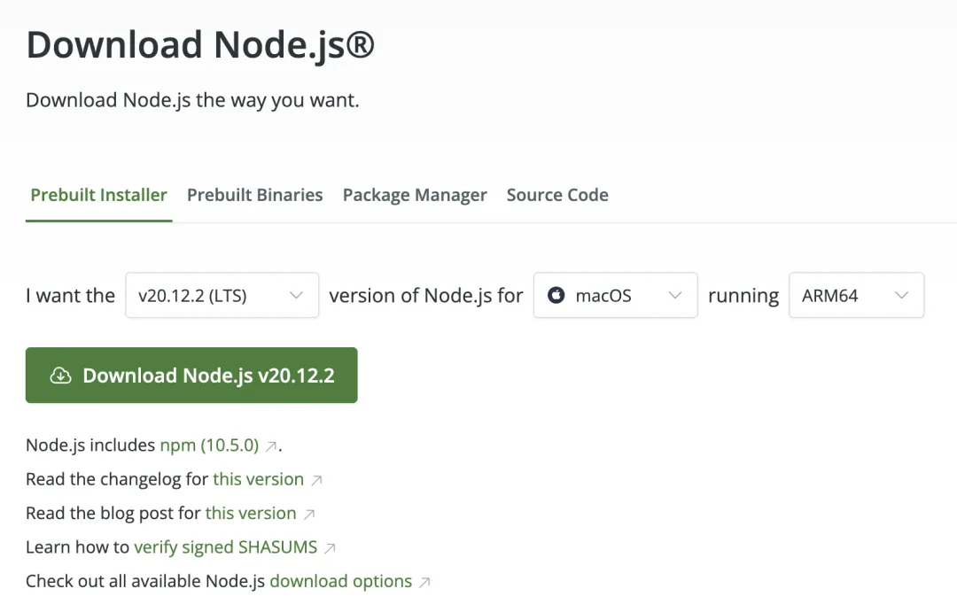 小伙伴可以前往(https://nodejs.org/en/download)根据自己的操作系统和CPU芯片类型下载对应的Node.js并进行安装。