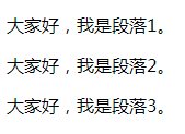 显示效果:<p>大家好,我是段落1。</p> <p>大家好,我是段落2。</p> <p>大家好,我是段落3。</p>