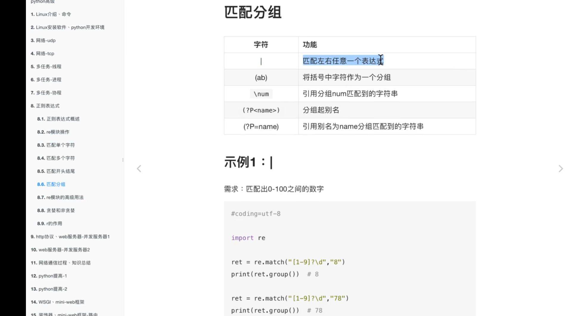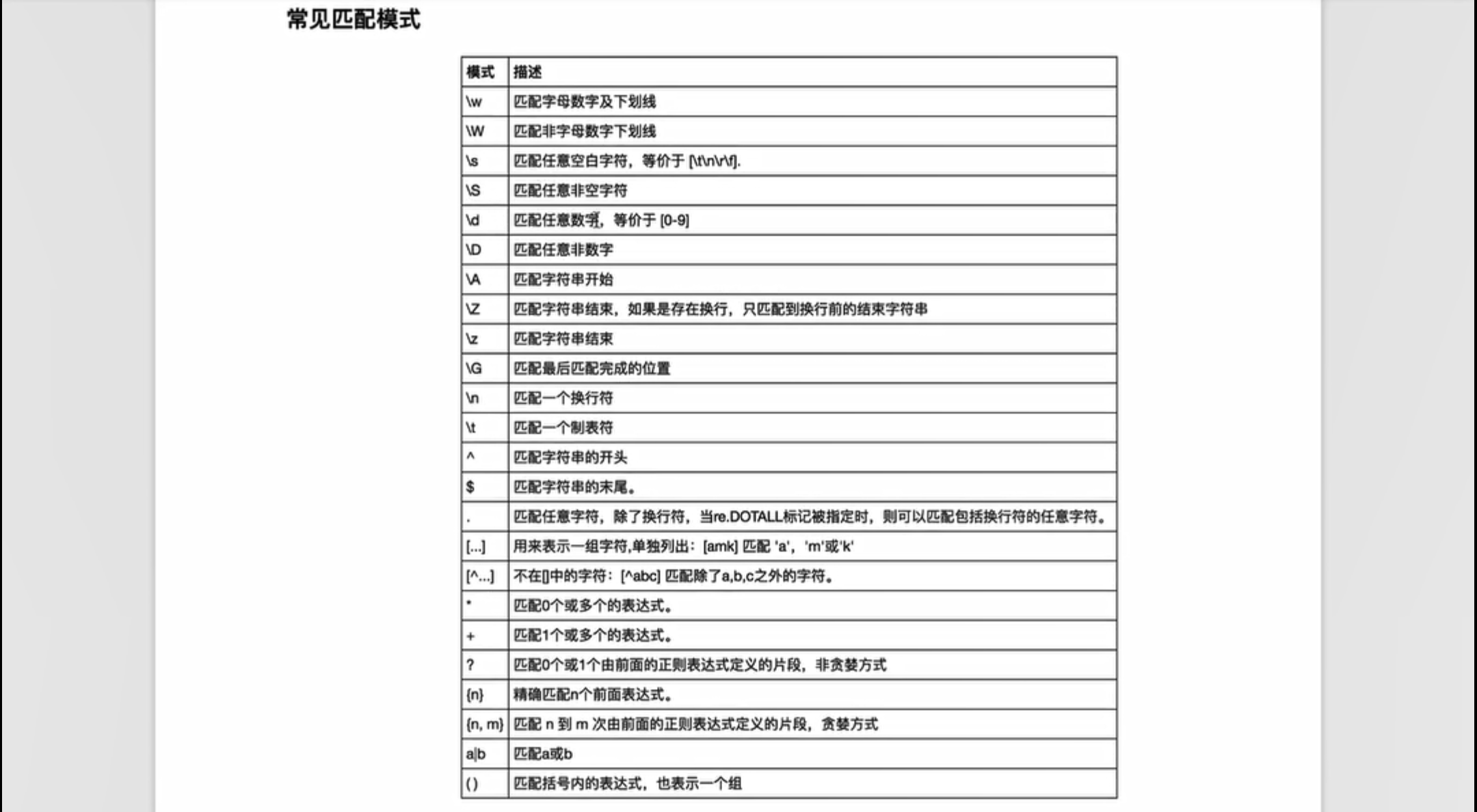 import re # todo re.match的用法,从字符串第一个开始匹配 content = 'Hello 123 4567 World_this a regex demo' # ^todo 匹配字符串开头,$匹配字符串结尾 result = re.match('^Hello\s\d{3}\s\d{4}\s\w{10}.*demo$',content) print(result) # todo 返回匹配范围 print(result.span()) # todo 返回匹配结果 print(result.group()) # todo 泛匹配 result = re.match('^Hello.*demo$',content) print(result.group()) # todo 匹配指定目标 result = re.match('^Hello\s(\d+)\s(\d+)\sWorld.*demo$',content) print(result.group(1),result.group(2)) # todo 贪婪匹配,尽可能匹配多的字符 result = re.match('^He.*(\d+).*demo$',content) print(result.group(1)) # todo .*?非贪婪匹配,尽可能匹配少的字符 result = re.match('^He.*?(\d+).*demo$',content) print(result.group(1)) contents = '''Hello 1234567 World_this is a regex demo''' # todo 匹配模式,re.S匹配换行 results = re.match('^He.*?(\d+).*?demo$',contents,re.S) print(results.group(1)) # todo 转义\,匹配特殊字符需要加转义符\ content = 'price is $5.00' result = re.match('price is \$5\.00',content) print(result)