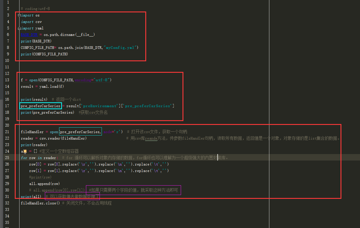 3.2 导入yaml库,使用库内的load方法,返回一个dict。并用csv库的reader方法得到一个对象。并使用for循环遍历取出csv文件的所有数据,返回一个list集合的数据。