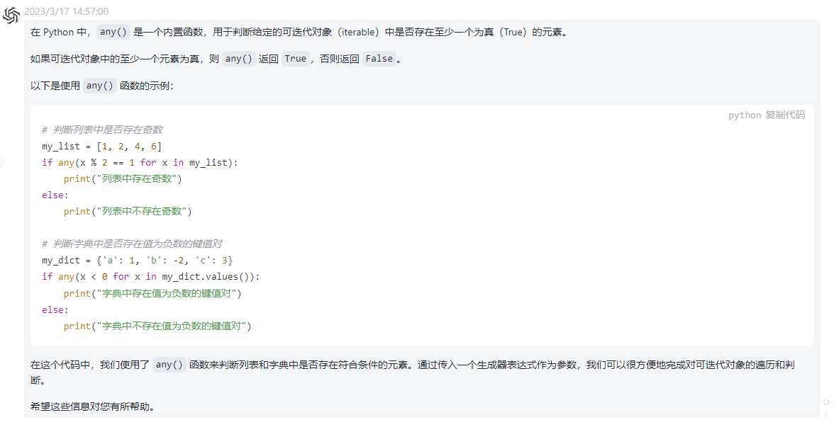 在这个代码中,我们使用了 any() 函数来判断列表和字典中是否存在符合条件的元素。通过传入一个生成器表达式作为参数,我们可以很方便地完成对可迭代对象的遍历和判断。