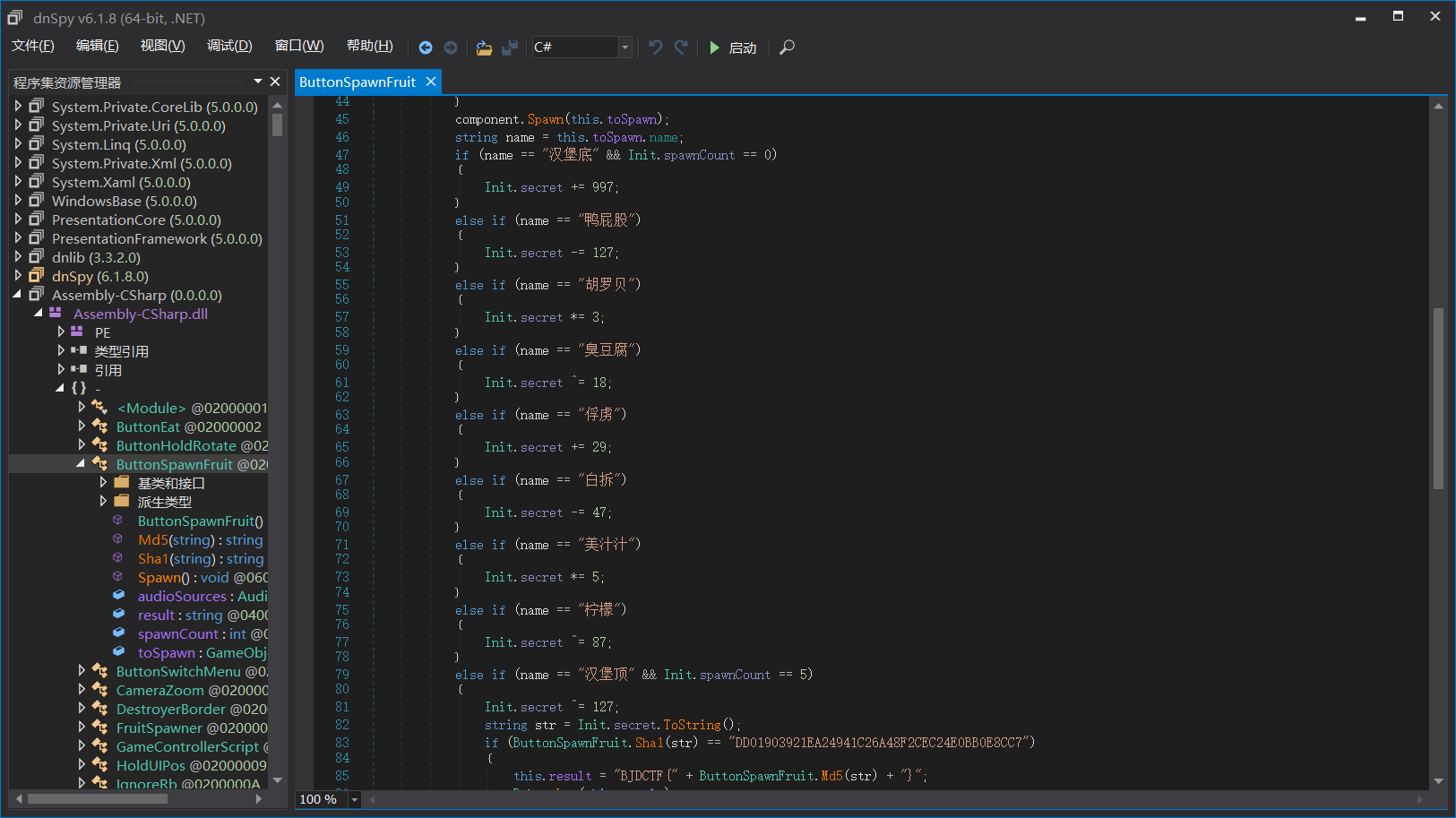 这里比较详细的说明了思路与套路。本题因为比较简单,所以直接从managed进去第一个就是那个Assembly-CSharp.dll文件,用dnspy打开后,就可以寻找主要函数来进行逆向了。