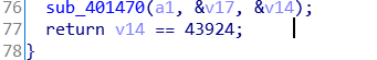 因为这个if要成立,所以这个return后面的表达式必须成立,及v14==43924成立,我们此处逆向分析(字面意思)