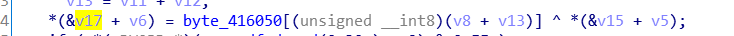 此处的异或,而通过上方的汇编代码我们可以知道上一行的 movzx ecx, [ebp+var_209]是将byte_416050的值存入ecx,此处的ecx的值即为我们想要知道的值!