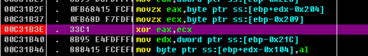 由此,我们得到了思路,在xor处下断点,使每次运行时程序停在xor的前一命令,方便我们得知ecx的值。