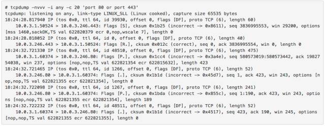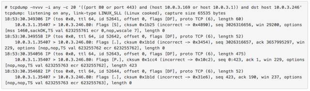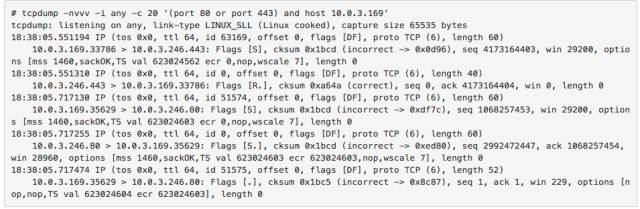# tcpdump -nvvv -i any -c 20 '(port 80 or port 443) and host 10.0.3.169'