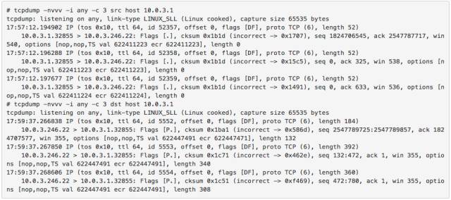 前面的例子显示了源和目的地址是 10.0.3.1 的流量,而上面的命令只显示数据包源地址是 10.0.3.1 的流量。这是通过在 host 前面增加 src 参数来实现的。这个额外的过滤器告诉 tcpdump 查找特定的源地址。 反过来通过 dst 过滤器,可以指定目的地址。
