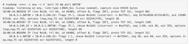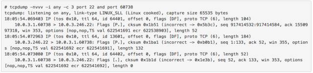 # tcpdump -nvvv -i any -c 3 port 22 and port 60738