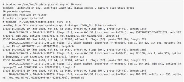 通常这些数据被缓存而不会被写入文件,直到你用 CTRL+C 结束 tcpdump 命令的时候。