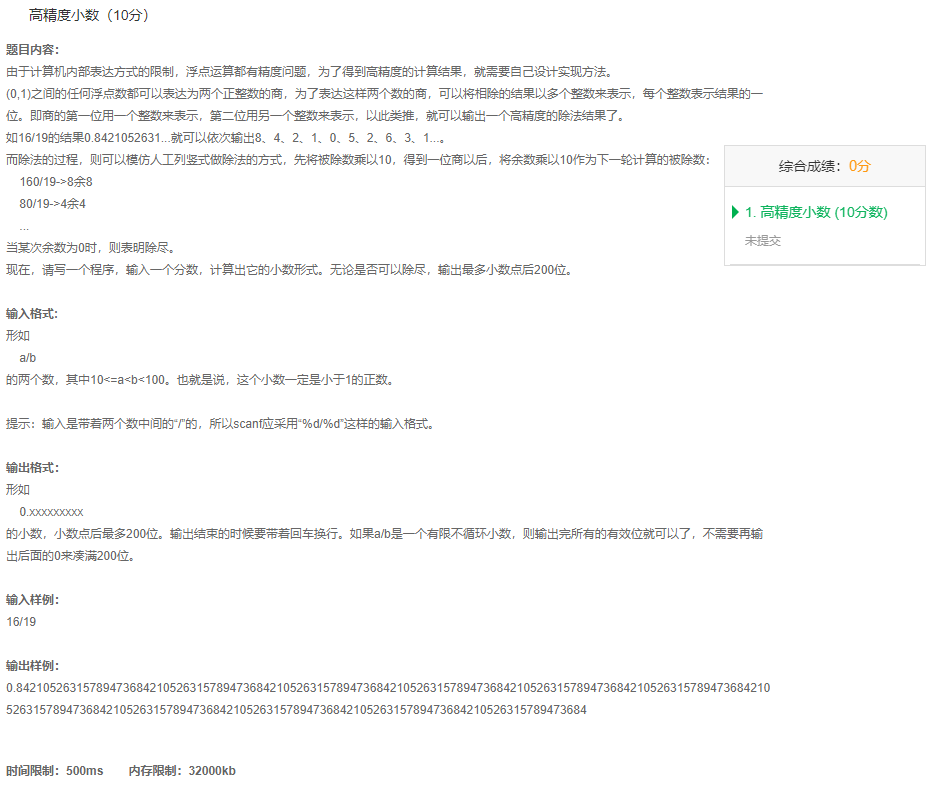 1 #include <stdio.h> 2 3 4 5 int main(int argc, char **argv) { 6 7 int _int=0; 8 9 int arrays[200]={0}; 10 11 int a,b,c; 12 13 int i; 14 15 16 17 scanf("%d/%d",&a,&b); 18 19 20 21 for(i=0;i<200&&a>0;i++){ 22 23 arrays[i]=(a*10)/b; 24 25 a=(a*10)%b; 26 27 if(a==0){ 28 29 arrays[i+1]=-1; 30 31 }; 32 33 }; 34 35 36 37 for(i=0;i<200&&arrays[i]!=-1;i++){ 38 39 if(i>0){ 40 41 printf("%d",arrays[i]); 42 43 }else{ 44 45 printf("%d.",arrays[i]); 46 47 } 48 49 }; 50 51 printf("\n"); 52 53 54 55 return 0; 56 57 }