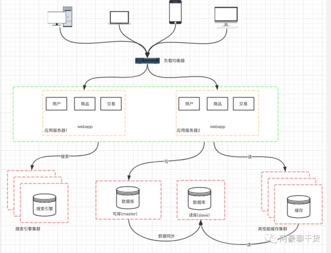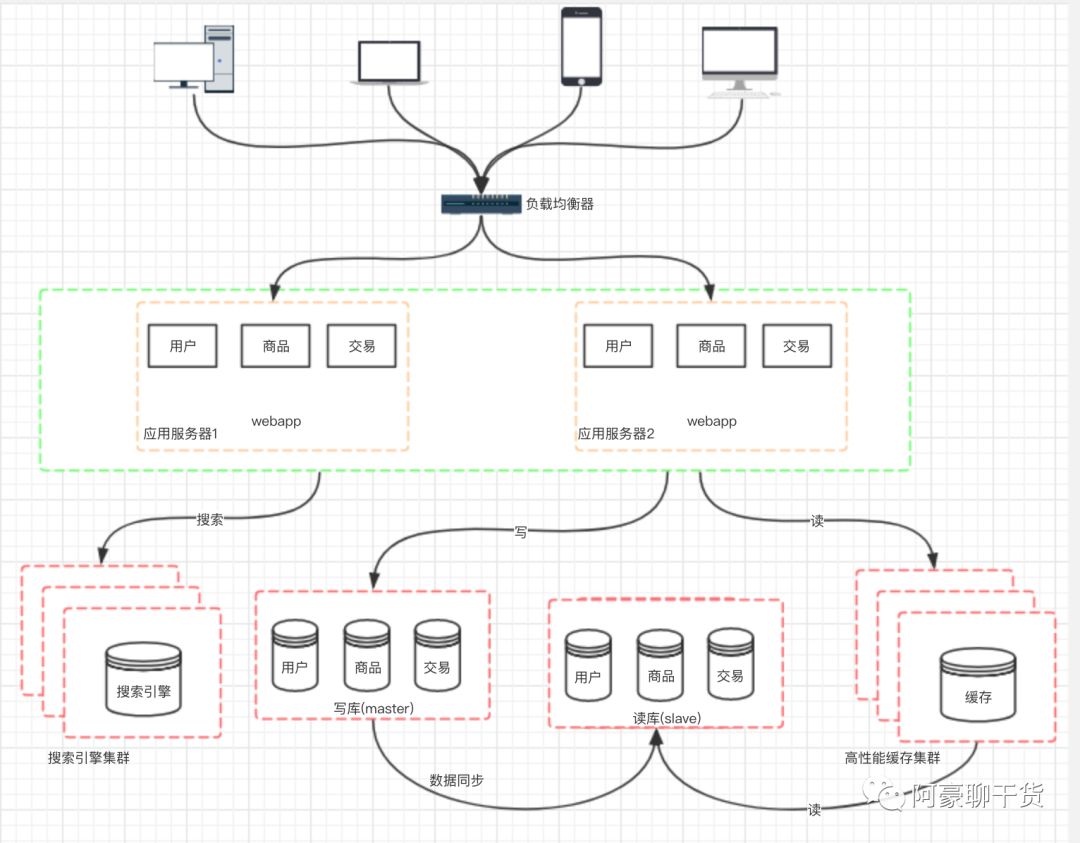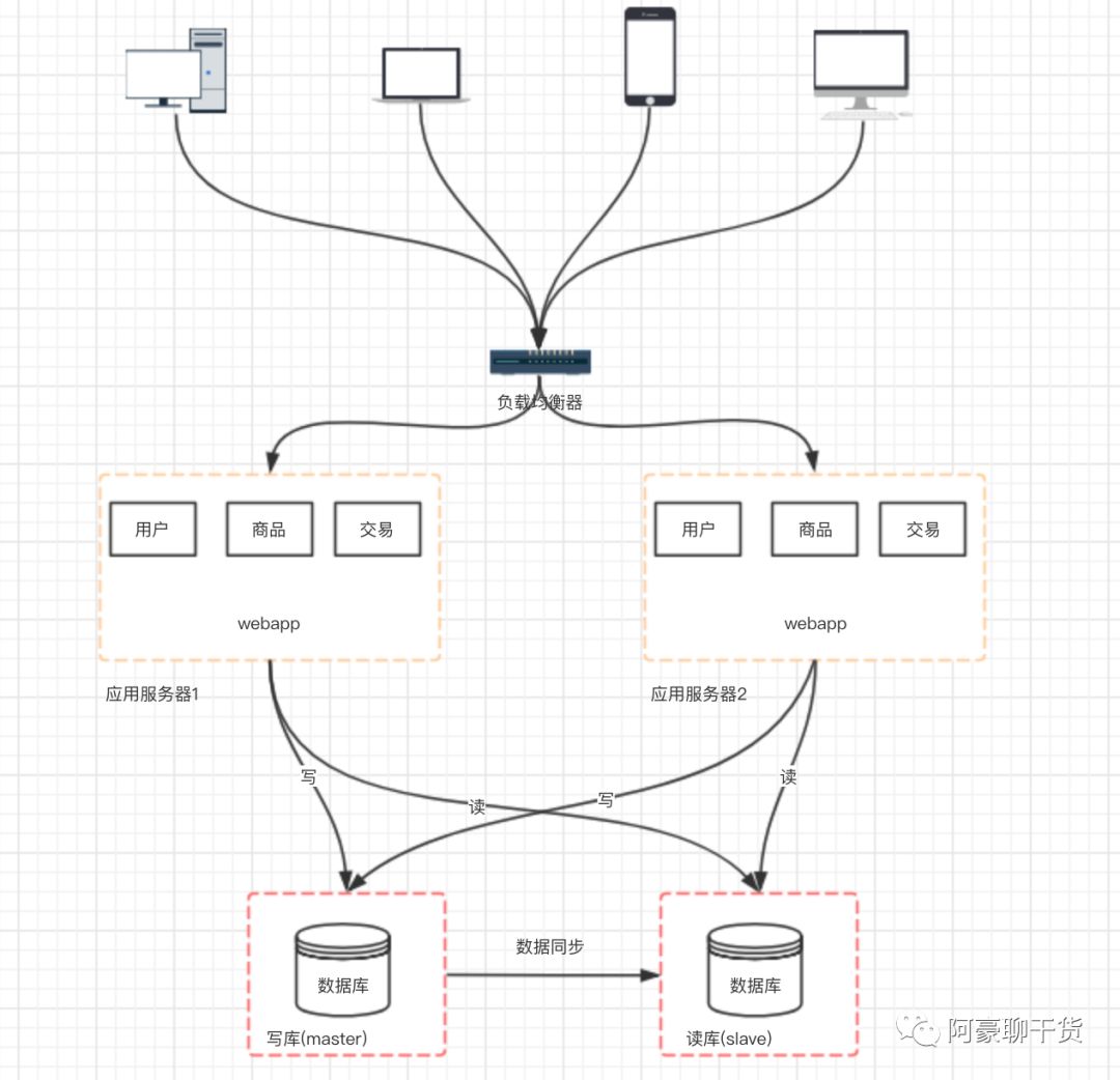 架构演变到上面的阶段,并不是终点。通过上面的设计,应用层的性能被我们拉上来了, 但数据库的负载也在逐渐增大,那如何去提高数据库层面的性能呢?有了前面的设计思路以后,我们自然也会想到通过增加服务器来提高性能。但假如我们单纯的把数据库一分为二,然后对于数据库的请求,分别负载到两台数据库服务器上,那必定会造成数据库数据不统一的问题。 所以我们一般先考虑将数据库读写分离。