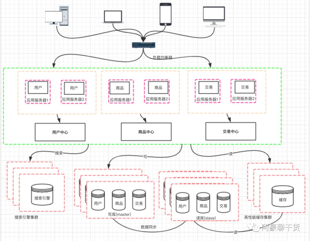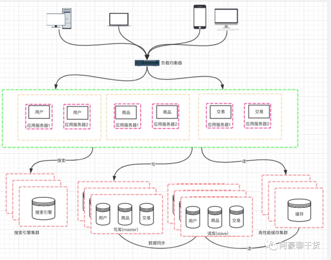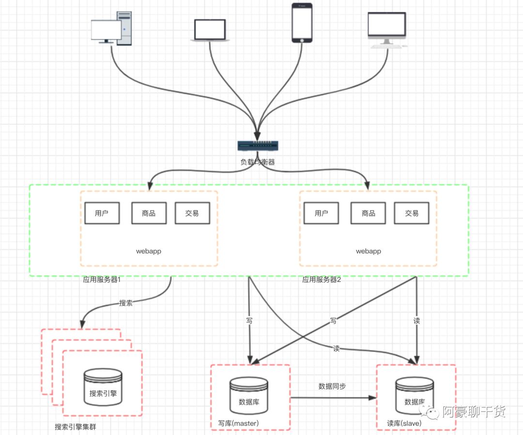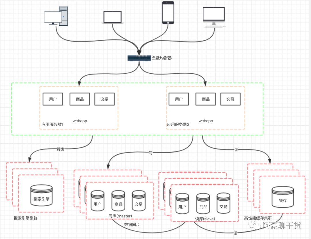 架构演变到上面的阶段,并不是终点。通过上面的设计,应用层的性能被我们拉上来了, 但数据库的负载也在逐渐增大,那如何去提高数据库层面的性能呢?有了前面的设计思路以后,我们自然也会想到通过增加服务器来提高性能。但假如我们单纯的把数据库一分为二,然后对于数据库的请求,分别负载到两台数据库服务器上,那必定会造成数据库数据不统一的问题。 所以我们一般先考虑将数据库读写分离。