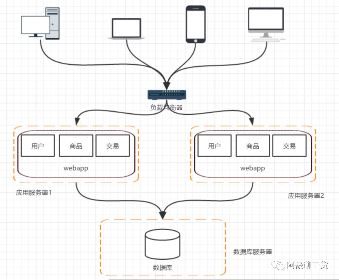 这个阶段,随着访问量的继续不断增加,单台应用服务器已经无法满足我们的需求。 假设我的数据库服务器还没有遇到性能问题,那我们可以通过增加应用服务器的方式来将应用服务器集群化,这样就可以将用户请求分流到各个服务器中,从而达到继续提升系统负载能力的目的。此时各个应用服务器之间没有直接的交互,他们都是依赖数据库各自对外提供服务。