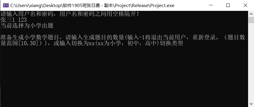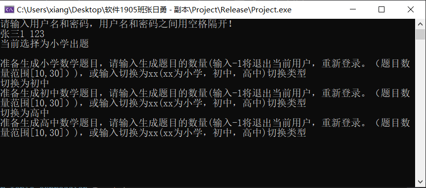 4) 能够在命令行输入切换信息进行相应出题年级切换,实现了更改出题难度的功能。