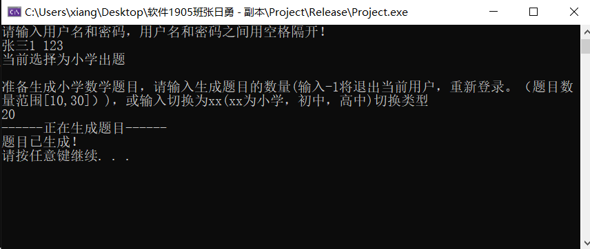 - 用户只能生成一次题目后程序就退出了,个人觉得如果能够实现多次出题会更好