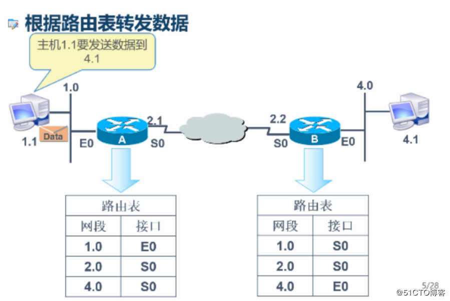 主机1.1要发送数据到主机4.1,首先数据会通过E0端口发送给路由器A、路由器会通过路由表确定有网段为4.0接口为S0发送数据给路由器B,路由器B通过路由表确定网段4.0接口为E0发送数据到主机4.1