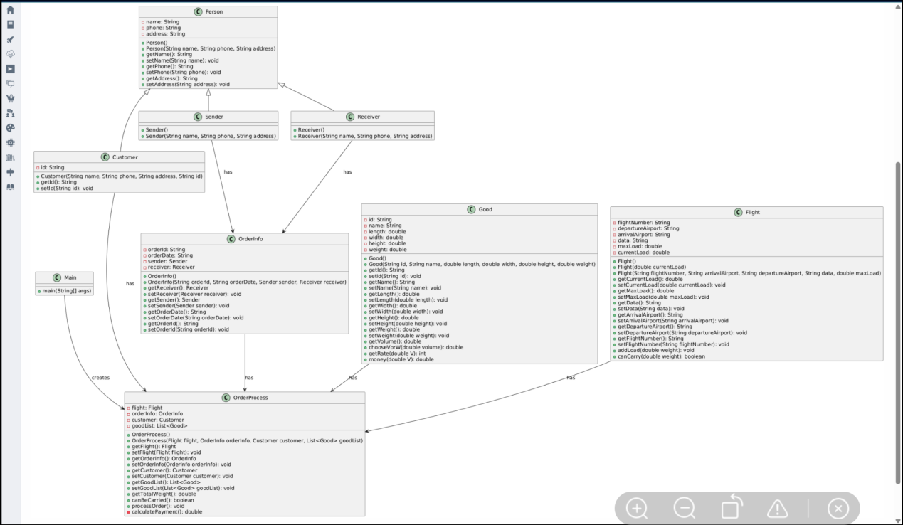 3.航班与订单:Flight类管理载重限制,OrderInfo与OrderProcess组合处理订单信息和流程,符合 “数据与逻辑分离” 原则。