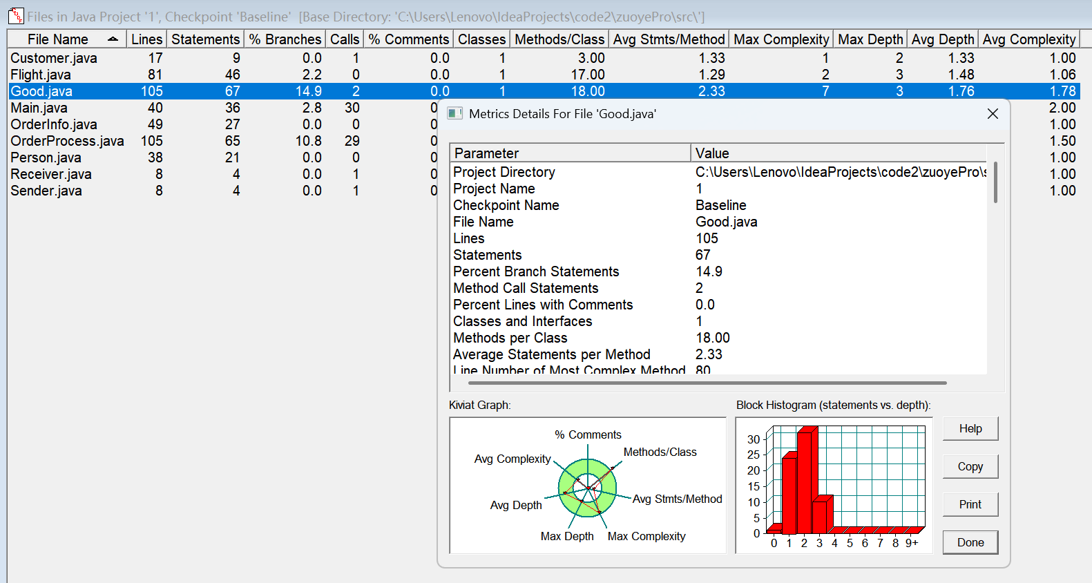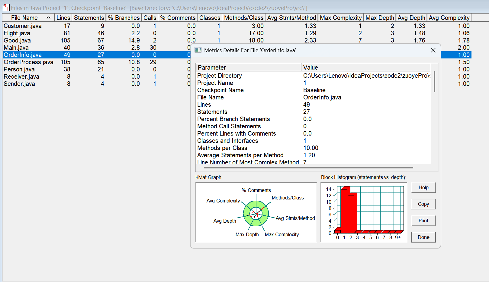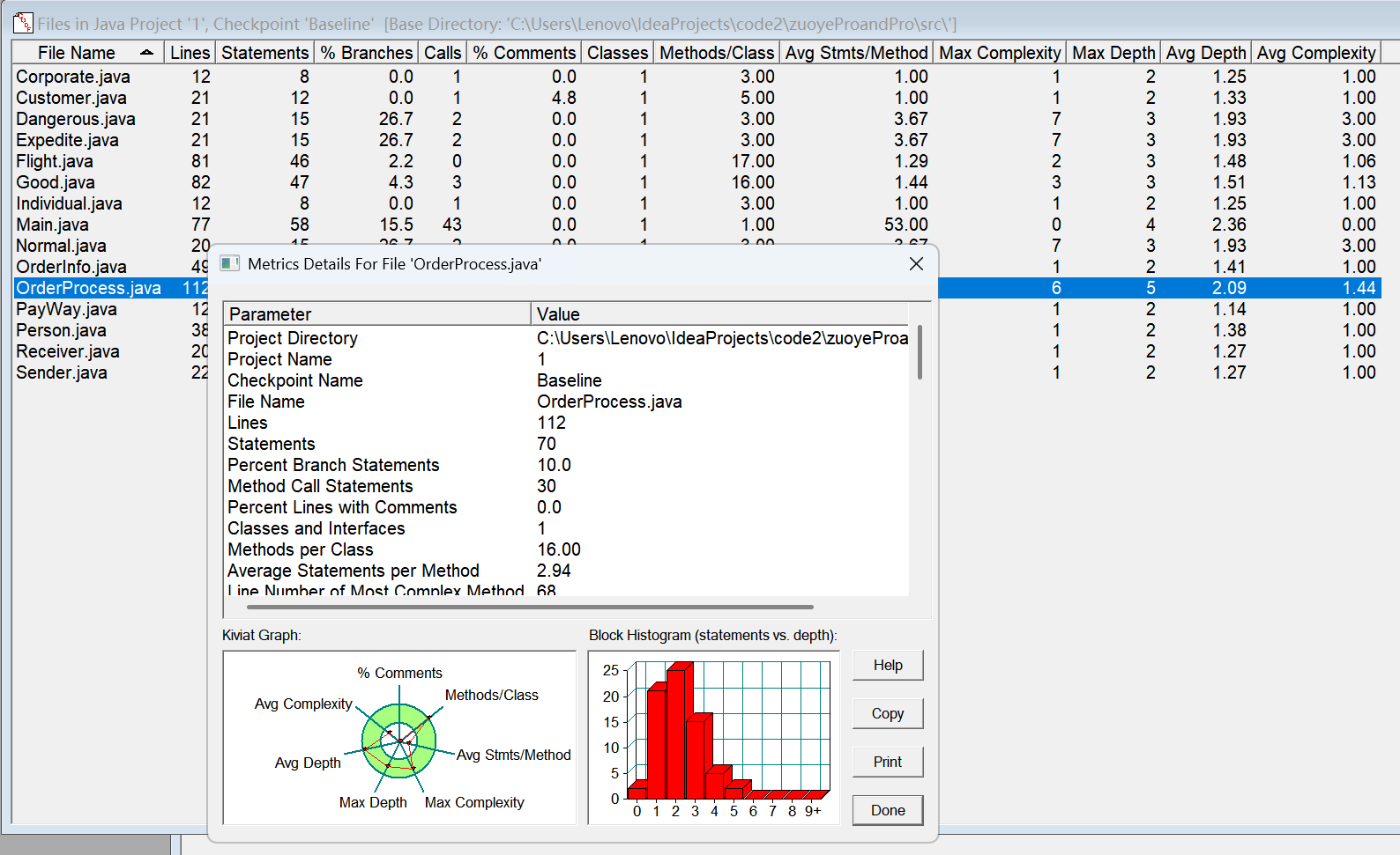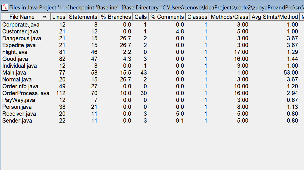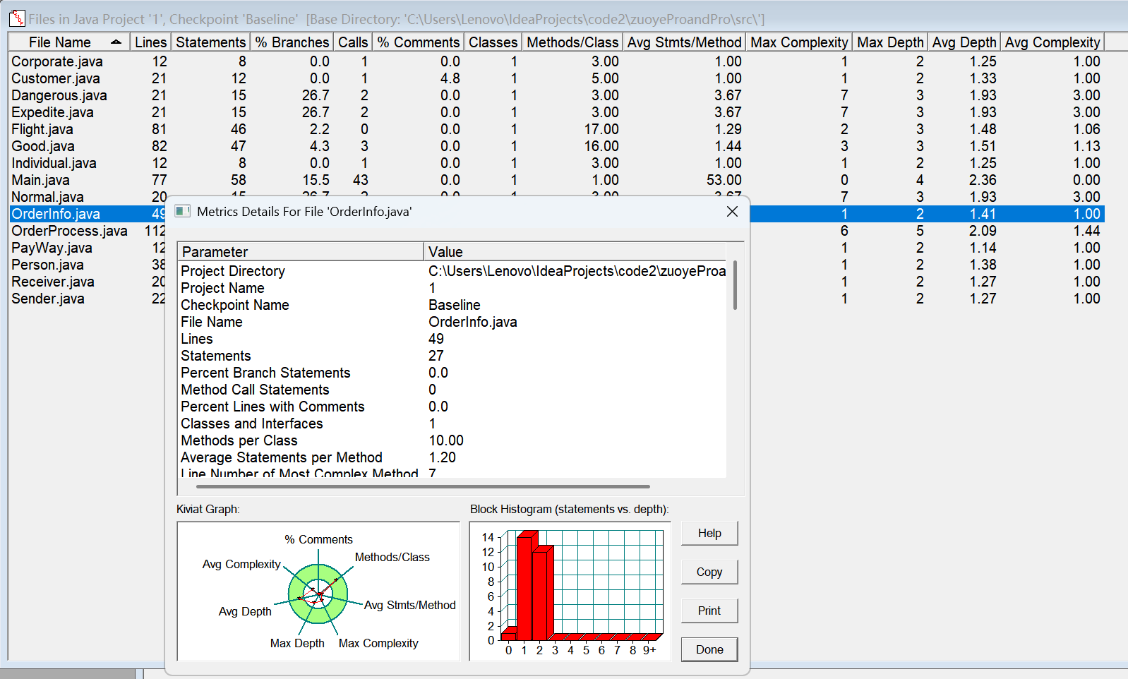 对于类,有OCavg和WMC两个项目,分别代表类的方法的平均循环复杂度和总循环复杂度。