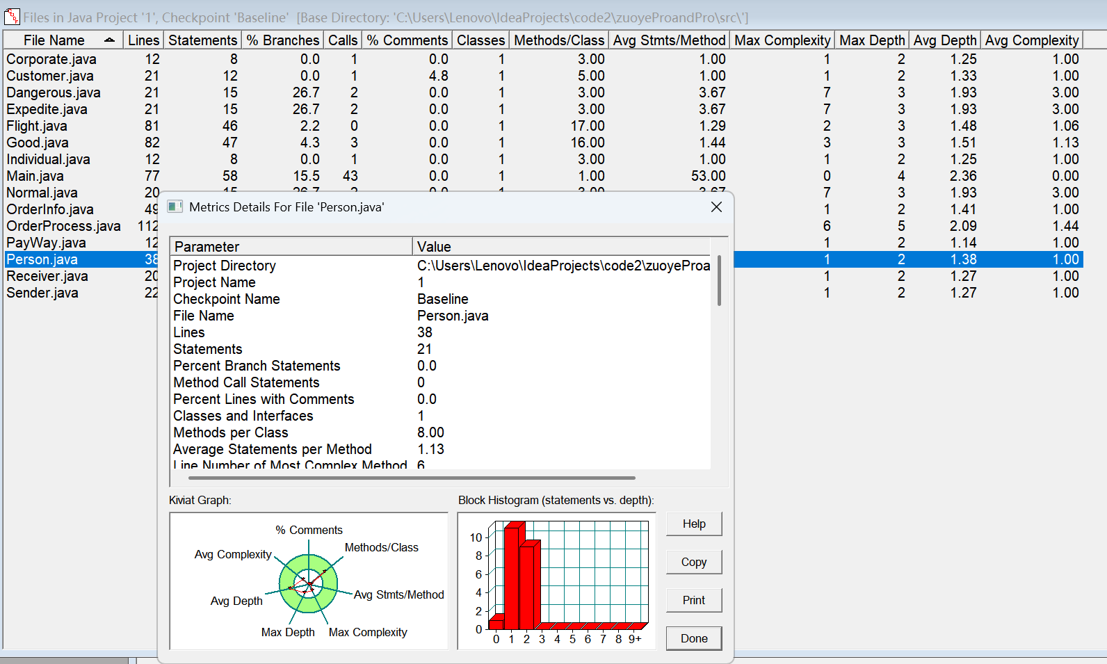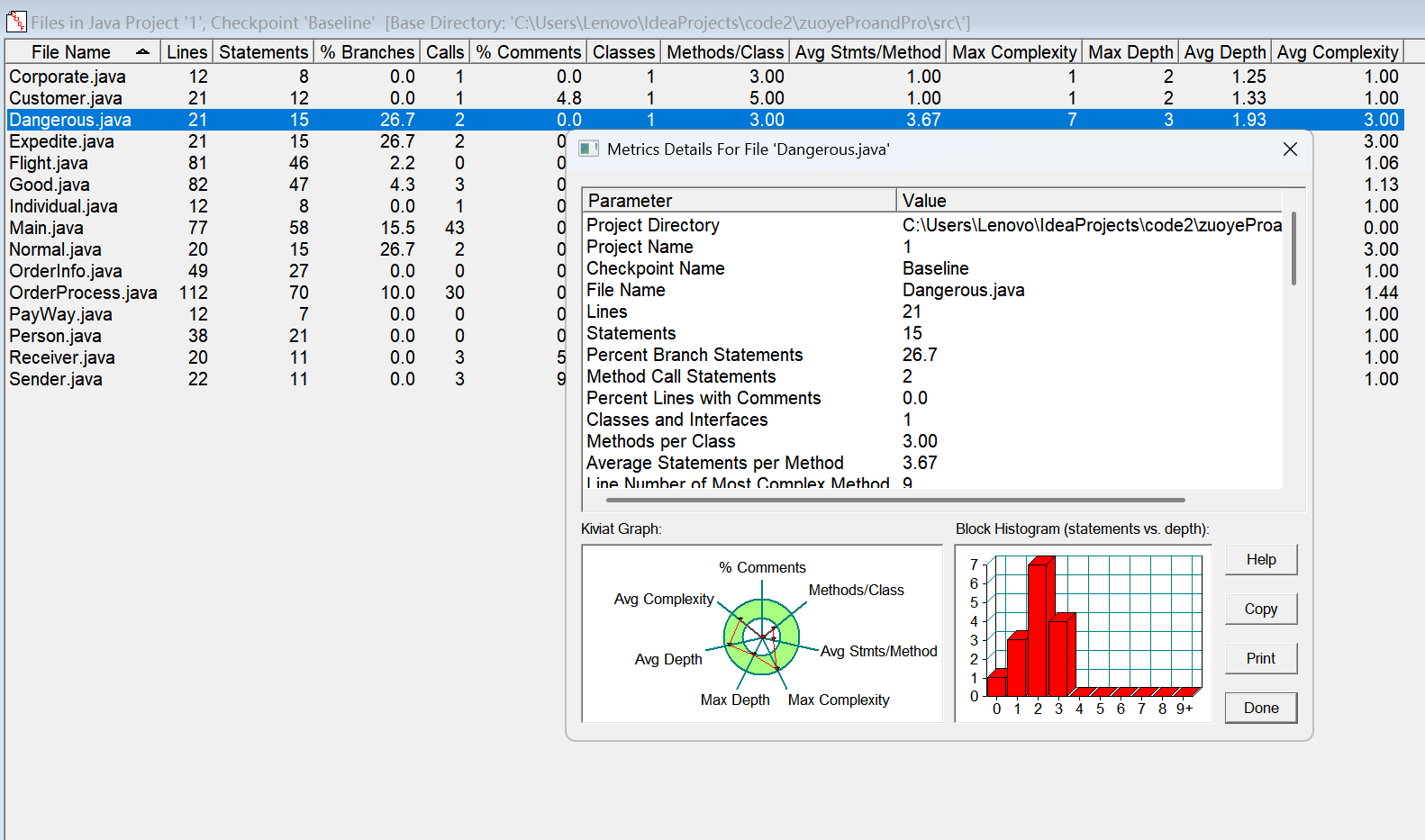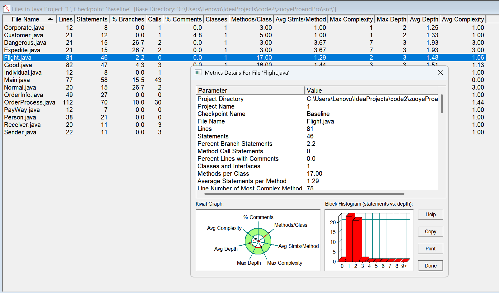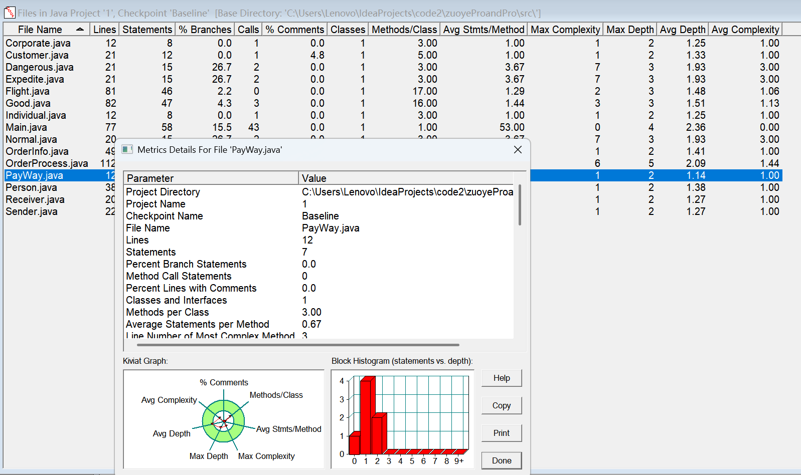 对于类,有OCavg和WMC两个项目,分别代表类的方法的平均循环复杂度和总循环复杂度。