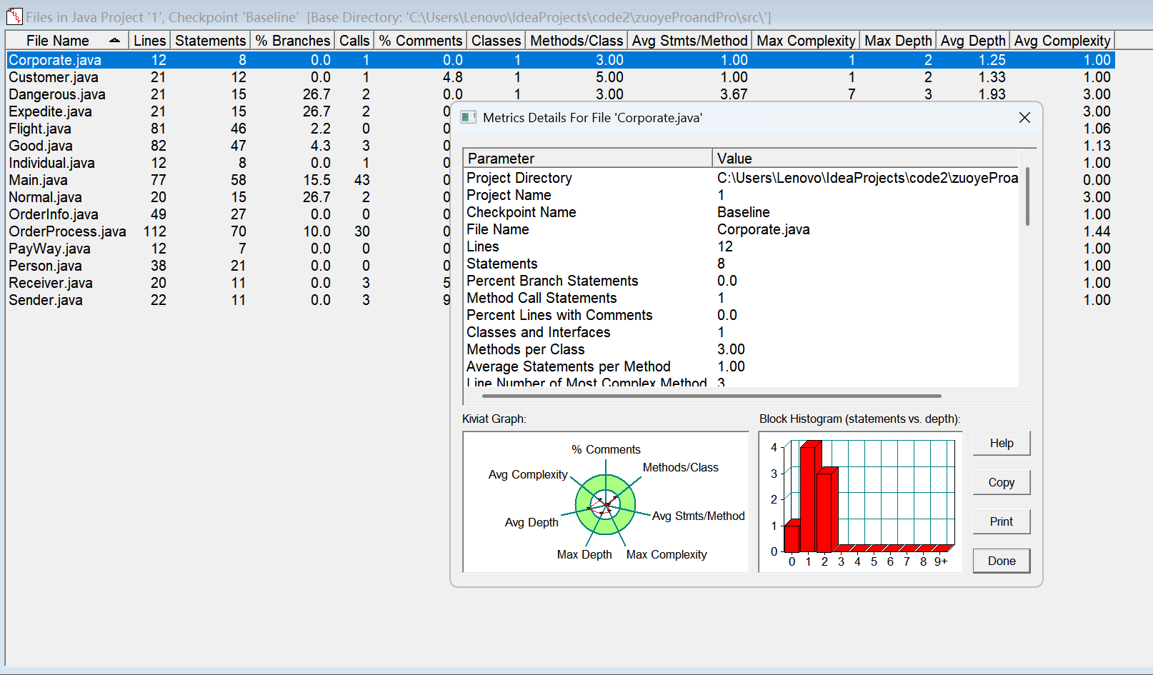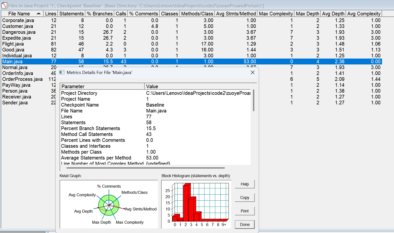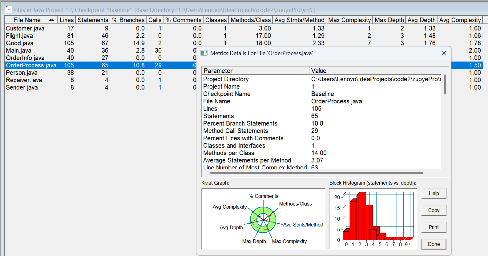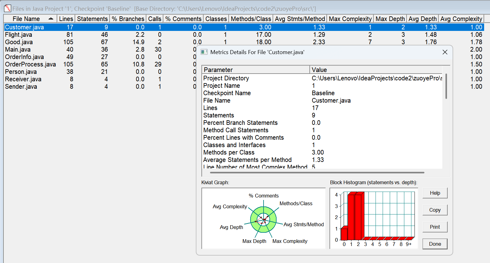 对于类,有OCavg和WMC两个项目,分别代表类的方法的平均循环复杂度和总循环复杂度。