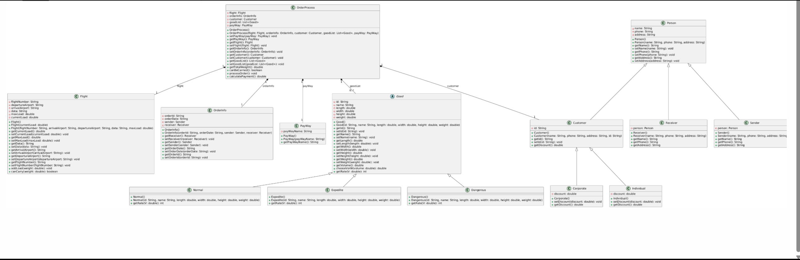 OrderProcess通过组合Flight、OrderInfo、Customer、Good等类实例,而非继承,体现 “组合优于继承” 的设计思想。