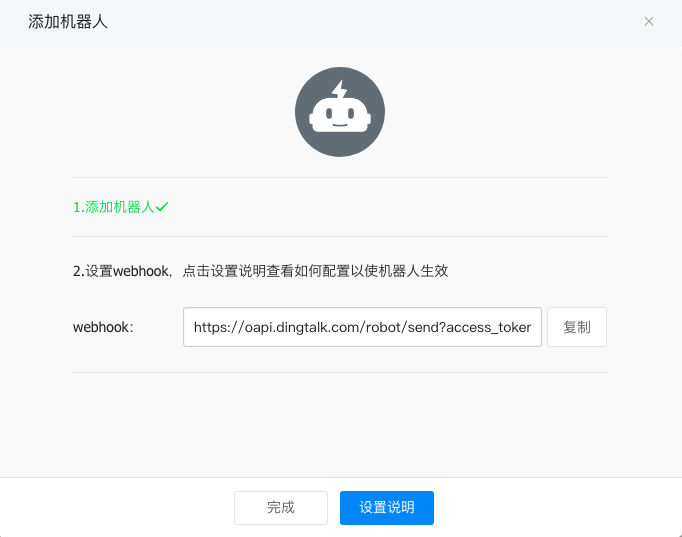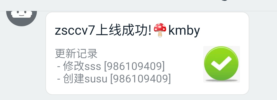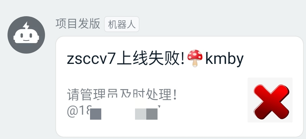 1 dingtalk ( 2 #机器人ID 3 robot: 'b9b37ae7-3132-4d9b-9b07-7021ad0e11be', 4 #数据类型 5 type: 'LINK', 6 #钉钉群里需要@的负责人 7 at:["18217472232"], 8 atAll: false, 9 #标题 10 title: "${PROJECK}上线成功!", 11 #报警内容 12 text:["更新记录\n$changeString"], 13 messageUrl: "${WEBURL}", 14 #图片链接地址 15 picUrl:'http://kmzsccfile.kmzssss.com/upload/2020/success.jpg', 16 singleTitle:'', 17 btns: [], 18 hideAvatar: false 19 )