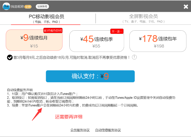 支付相关:在购买商品时存在连续包月的商品,但页面并没有给出详细的说明,包括订阅周期、订阅价格、付款、取消续订、隐私声明等信息。此部分信息需要在商品购买页面和苹果官网后台的