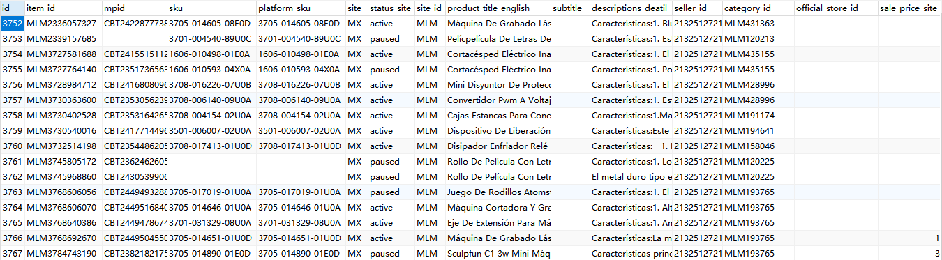 CREATE TABLE `yibai_meil_online_listing_new` ( `id` int(10) unsigned NOT NULL AUTO_INCREMENT COMMENT 'id', `item_id` varchar(50) NOT NULL DEFAULT '' COMMENT 'listing_id', `mpid` varchar(50) NOT NULL DEFAULT '' COMMENT 'item_id', `sku` varchar(50) NOT NULL DEFAULT '' COMMENT '平台sku,由平台规定', `platform_sku` varchar(150) NOT NULL DEFAULT '' COMMENT '平台sku(加密)', `site` varchar(10) NOT NULL DEFAULT '' COMMENT '老站点名', `status_site` varchar(50) NOT NULL DEFAULT '' COMMENT '商品状态', `site_id` varchar(50) NOT NULL DEFAULT '' COMMENT '站点', `product_title_english` varchar(200) NOT NULL DEFAULT '' COMMENT '标题', `subtitle` varchar(50) NOT NULL DEFAULT '' COMMENT '副标题', `descriptions_deatil` text COMMENT '描述', `seller_id` varchar(50) NOT NULL DEFAULT '' COMMENT '卖方的用户id', `category_id` varchar(50) NOT NULL DEFAULT '' COMMENT '分类id', `official_store_id` varchar(50) NOT NULL DEFAULT '' COMMENT '卖方的官方商店id', `sale_price_site` decimal(10,0) NOT NULL DEFAULT '0' COMMENT '售价', `base_price` decimal(10,0) NOT NULL DEFAULT '0' COMMENT '底价', `original_price` decimal(10,0) NOT NULL DEFAULT '0' COMMENT '商品的原价', `currency_id` varchar(50) NOT NULL DEFAULT '0.0' COMMENT '币别', `initial_quantity` bigint(10) NOT NULL DEFAULT '0' COMMENT '原有的数量', `available_quantity` bigint(10) NOT NULL DEFAULT '0' COMMENT '可售数量', `sold_quantity` bigint(10) NOT NULL DEFAULT '0' COMMENT '销量', `sale_terms` varchar(500) NOT NULL DEFAULT '' COMMENT '销售条件', `buying_mode` varchar(50) NOT NULL DEFAULT '' COMMENT '购买模式', `listing_type_id` varchar(50) NOT NULL DEFAULT '' COMMENT 'listing_type_id', `start_time` datetime NOT NULL DEFAULT '0000-00-00 00:00:00' COMMENT '上架时间', `stop_time` datetime NOT NULL DEFAULT '0000-00-00 00:00:00' COMMENT '停售时间', `condition` varchar(50) NOT NULL DEFAULT '' COMMENT '条件', `permalink` varchar(350) NOT NULL DEFAULT '' COMMENT '商品链接', `thumbnail` varchar(200) NOT NULL DEFAULT '' COMMENT '主图', `pictures` varchar(1500) NOT NULL DEFAULT '' COMMENT '子图', `video_id` varchar(50) NOT NULL DEFAULT '' COMMENT '视频id', `accepts_mercadopago` varchar(50) NOT NULL DEFAULT '' COMMENT 'mercado pago付款方式', `non_mercado_pago_payment_methods` varchar(200) NOT NULL DEFAULT '' COMMENT '非mercado pago付款方式', `shipping` varchar(500) NOT NULL DEFAULT '' COMMENT '发货详细资料', `international_delivery_mode` varchar(50) NOT NULL DEFAULT '' COMMENT '国际交付模式', `seller_contact` varchar(50) NOT NULL DEFAULT '' COMMENT '卖家联系', `location` varchar(200) NOT NULL DEFAULT '' COMMENT '位置', `geolocation` varchar(200) NOT NULL DEFAULT '' COMMENT '定位', `coverage_areas` varchar(50) NOT NULL DEFAULT '' COMMENT '覆盖范围', `attributes` text COMMENT '属性', `warnings` varchar(200) NOT NULL DEFAULT '' COMMENT '警告信息', `listing_source` varchar(50) NOT NULL DEFAULT '' COMMENT '指示项目列表源', `sub_status` varchar(200) NOT NULL DEFAULT '' COMMENT '内部修饰词和/或状态', `tags` varchar(500) NOT NULL DEFAULT '' COMMENT '标签', `warranty` varchar(50) NOT NULL DEFAULT '' COMMENT '指示是否对该物品提供担保', `catalog_product_id` varchar(50) NOT NULL DEFAULT '' COMMENT '链接到该项的目录产品id', `domain_id` varchar(200) NOT NULL DEFAULT '' COMMENT '项目所属的域id', `parent_item_id` varchar(50) NOT NULL DEFAULT '' COMMENT '父项id', `differential_pricing` varchar(50) NOT NULL DEFAULT '' COMMENT '指定项目差异定价', `deal_ids` varchar(255) NOT NULL DEFAULT '' COMMENT '项目的交易id', `automatic_relist` varchar(50) NOT NULL DEFAULT '' COMMENT '指示该项目是否可以自动重新列表', `date_created` varchar(50) NOT NULL DEFAULT '' COMMENT '创建项目的日期', `last_updated` varchar(50) NOT NULL DEFAULT '' COMMENT '更新项目的日期', `health` varchar(50) NOT NULL DEFAULT '' COMMENT '健康状况百分比', `catalog_listing` varchar(50) NOT NULL DEFAULT '' COMMENT '指定项目是否为目录列表', `product_linelist_id` int(11) NOT NULL DEFAULT '0' COMMENT '产品线id', `main_product_linelist_id` int(11) NOT NULL DEFAULT '0' COMMENT 'main产品线id', `sale_cost_price` decimal(10,2) NOT NULL DEFAULT '0.00' COMMENT '保本价', `old_price` decimal(10,2) NOT NULL DEFAULT '0.00' COMMENT '原刊登价', `account_id` int(11) NOT NULL DEFAULT '0' COMMENT '账号', `user_logistic_type` varchar(50) NOT NULL DEFAULT '' COMMENT '物流类型', `rate_profit` decimal(11,2) NOT NULL DEFAULT '0.00' COMMENT '利润率', `gross_profit_rate` decimal(11,2) NOT NULL DEFAULT '0.00' COMMENT '毛利率', `variation_multi` tinyint(1) NOT NULL DEFAULT '0' COMMENT '是否变体', `updated_at` datetime NOT NULL DEFAULT '0000-00-00 00:00:00' COMMENT '更新时间', `created_at` datetime NOT NULL DEFAULT '0000-00-00 00:00:00' COMMENT '拉取时间', `visits_num` int(11) NOT NULL DEFAULT '0' COMMENT '浏览量', `upc` varchar(50) NOT NULL DEFAULT '' COMMENT 'upc', `sales_id` int(11) NOT NULL DEFAULT '0' COMMENT '销售员id', `del_status` int(11) NOT NULL DEFAULT '1' COMMENT 'listing删除状态 1.未删除 2.已删除', `sku_status` int(11) NOT NULL DEFAULT '1' COMMENT '产品停售标识 1.未停售 2.已停售', `price_usd` decimal(10,2) NOT NULL DEFAULT '0.00' COMMENT '美元价格', PRIMARY KEY (`id`), UNIQUE KEY `idx_item_id` (`item_id`), KEY `idx_mpid` (`mpid`), KEY `idx_sku` (`sku`), KEY `idx_site` (`site`), KEY `idx_account_id` (`account_id`), KEY `idx_status_site` (`status_site`), KEY `idx_del_status` (`del_status`), KEY `idx_sku_status` (`sku_status`) USING BTREE ) ENGINE=InnoDB AUTO_INCREMENT=1 DEFAULT CHARSET=utf8 COMMENT='mercadolibre在线listing新api';