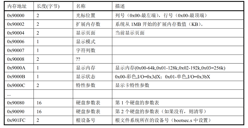 利用BIOS提供中断服务程序从设备上提取内核运行所需的机器系统数据,并将这些系统数据加载到内存0x90000-0x901FD(510B)处,供内核相关程序使用(覆盖了已经完成使命的bootsect代码)。如表所示: