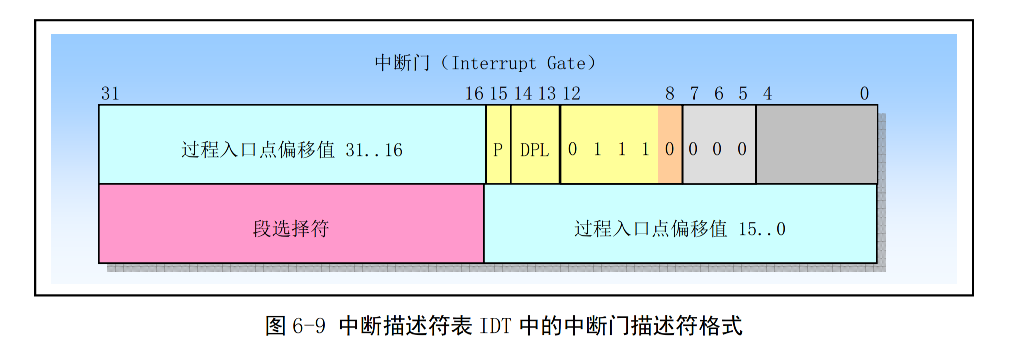由于内核代码段一直存在于内存中, 并且特权级为 0,即 P=1 , DPL=00。因此中断门描述符的字节 5 和字节 4 的值应该是 0x8E00。