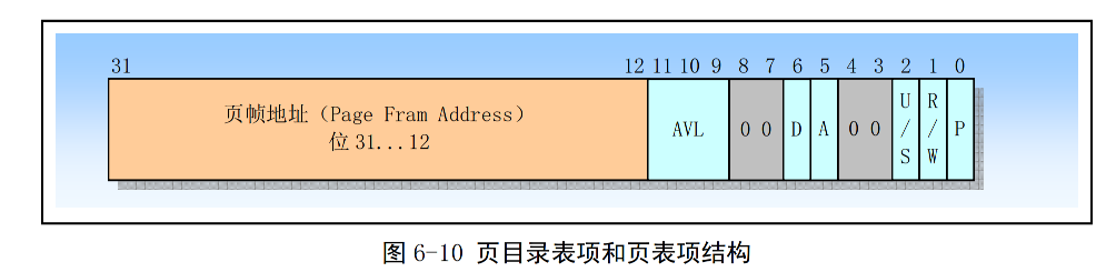 将页目录表放在绝对物理地址 0 开始处(也是本程序所处的物理内存位置,因此这段程序将被覆盖掉),紧随后面放置共可寻址 16MB 内存的 4 个页表,并分别设置它们的表项。页目录表项和页表项格式见图 6- 10 所示。其中 P 是页面存在于内存标志; R/W 是读写标 志; U/S 是用户/超级用户标志; A 是页面已访问标志; D 是页面内容已修改标志;最左边 20 比特是表项对应页面在物理内存中页面地址的高 20 比特位。