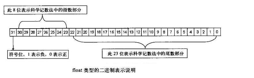 float类型在内存中占4个字节(32位),最高位用于表示符号;在剩下的31位中,从右向左了8位用于表示指数,其余用于表示尾数。如图: