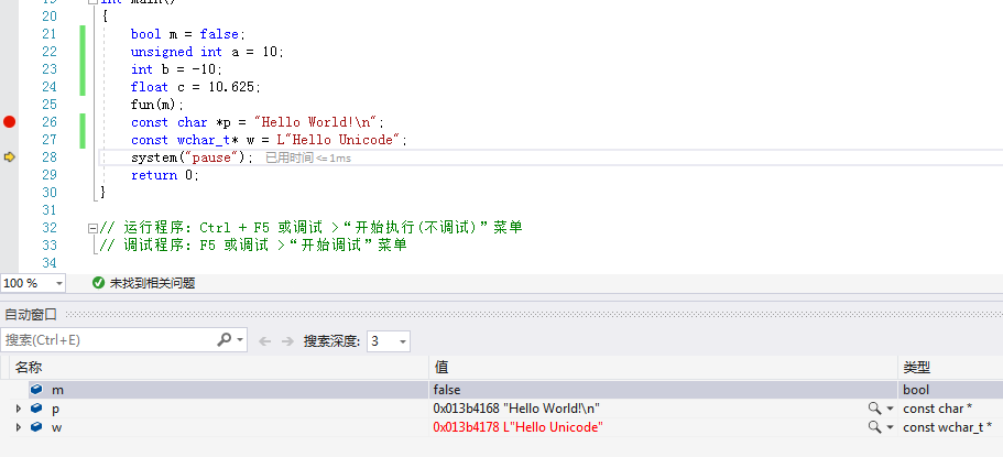 #include <iostream> void fun(bool flag) { if (flag) { printf("hello world\n"); } else { printf("sorry.\n"); } //int a = 0, b = 4; //int c = b / a; } int main() { bool m = false; unsigned int a = 10; int b = -10; float c = 10.625; fun(m); const char *p = "Hello World!\n"; const wchar_t* w = L"hello Unicode"; system("pause"); return 0; }