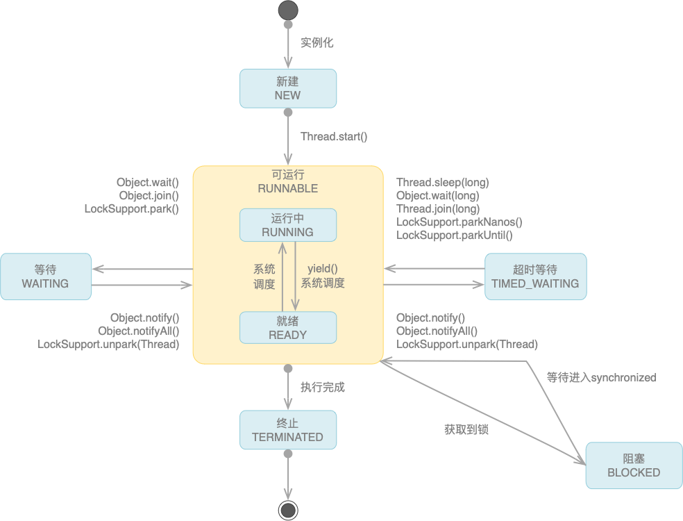 1、线程生命周期:NEW、RUNNABLE(READY、RUNNING)、BLOCKED、WAITING、TIMED_WAITING、TERMINATED状态