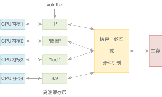 如果由于同步需要,某行代码使用了volatile关键字,那么当CPU内核1收到指令时,会立即将它位于高速缓存中的数据(这里是字符串“1”)写到主存中去,那么其余的数据(“哈哈”、“test”、9.9)会全部失效。