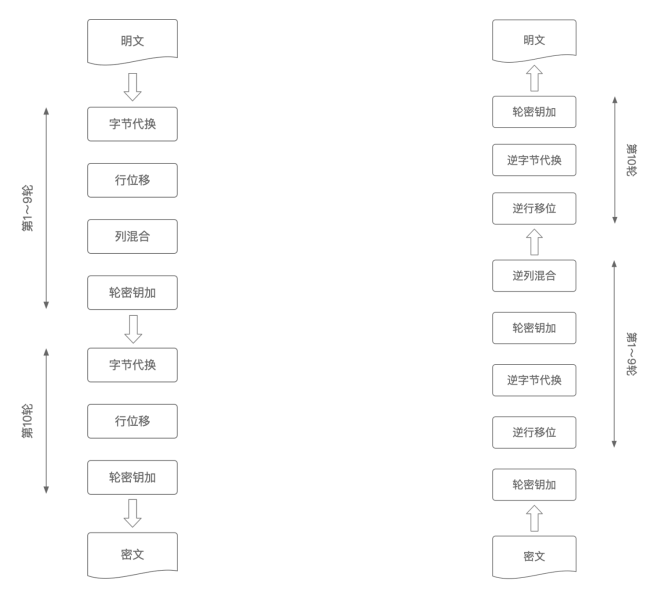 AES的加密过程大体上可以分为字节代换、行位移、列混合和轮密钥加这几个步骤,把DES的混淆和扩散最大化。AES也采取分组加密的方式,就是把一段话分成几段,每一段分别加密,然后再把它们拼接到一起成为密文。同样会把明文用相同的加密方法重复加密很多次。