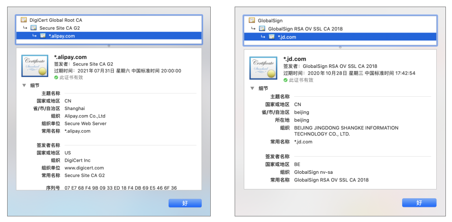 这种证书层级结构就是证书链。以刚才的某付宝举例,它的的证书层级有三个级别: