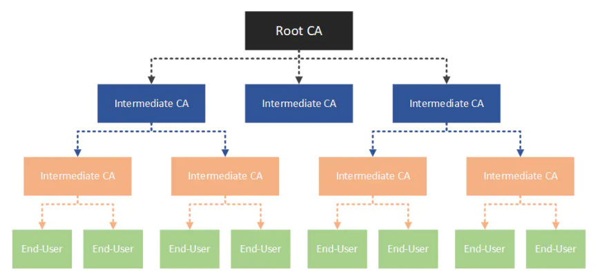 为了得到终端用户的公钥,就要得到终端用户证书。为了证明该证书可信,必须向上追溯该证书是否被中间签发人机构认证。继续线上追溯,直到找到最终的Root CA。