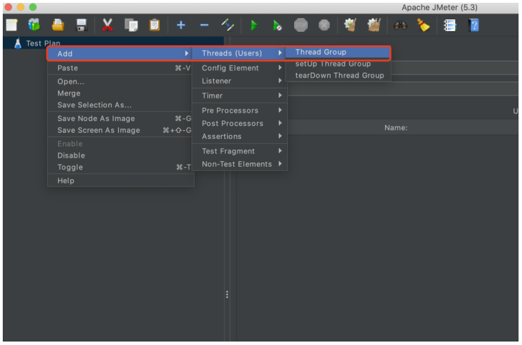 「Test Plan」上点击鼠标右键,依次选择「Add」->「Thread」->「Thread Group」