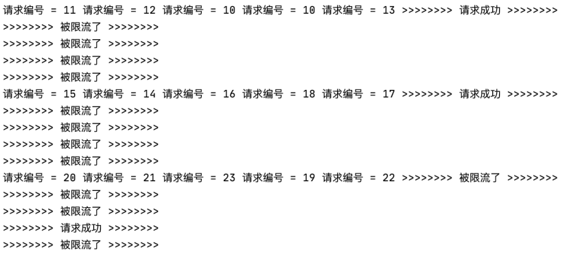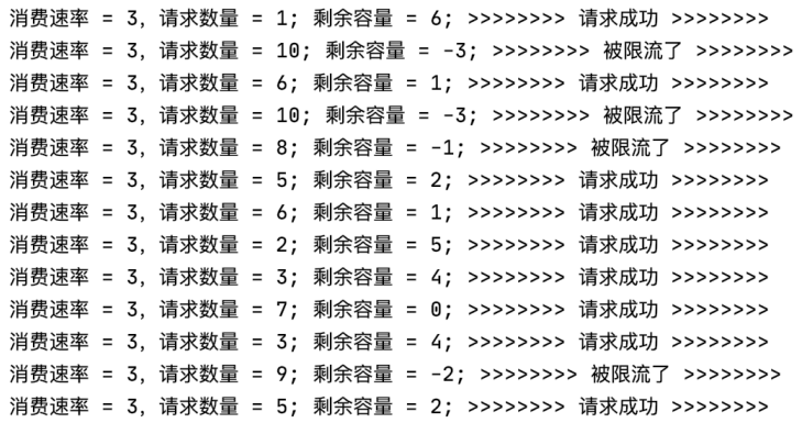 System.out.println("剩余容量 = " + (total - (requests + rate)) + "; >>>>>>>> 被限流了 >>>>>>>>");