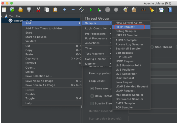 「Thread Group」上点击鼠标右键,依次选择「Add」->「Sampler」->「HTTP Request」